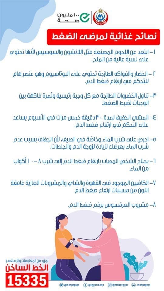وجاء بالنصائح أن الحضار والفواكه تحتوى على البوتاسيوم وهو عنصر هام فى التحكم فى ضغط الدم وطالبت الوزارة بالمشى والحركة لمدة 30 دقيقة 5 مرات في الأسبوع.