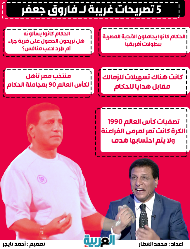 إنفوجراف.. 5 تصريحات غريبة لـ "فاروق جعفر" السبت 25/يوليو/2020 - 02:54 م 7/25/2020 2:54:45 PM إعداد: محمد العطار - تصميم: احمد تايجر فاروق جعفر عدة تصريحات غريبة ادلى بها نجم الزمالك السابق فاروق جعفر خلال الساعات الأخيرة، جعلته حديث السوشيال ميديا.
