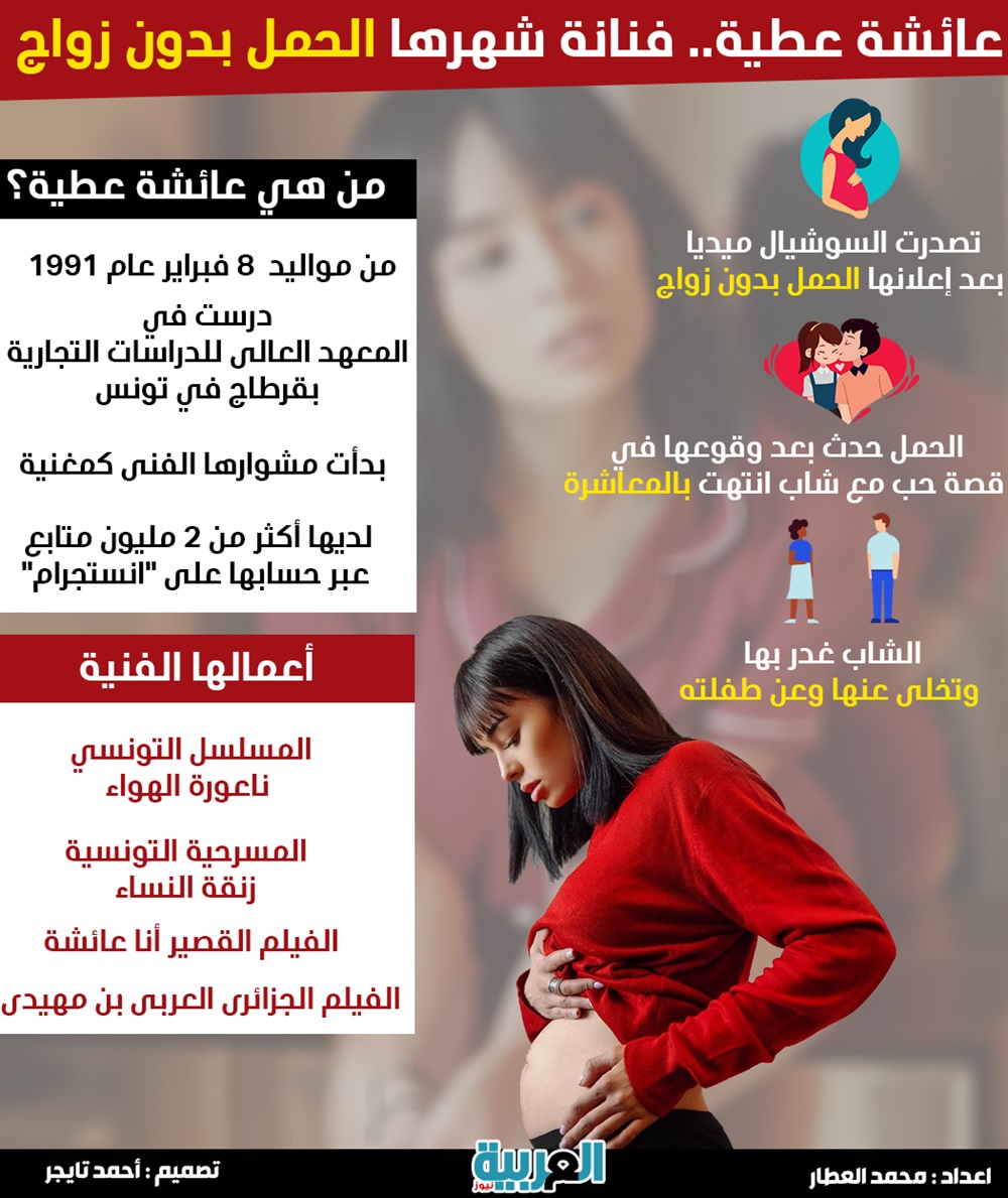 "انفوجراف" عائشة عطية.. فنانة شهرها الحمل بدون زواج الأربعاء 11/نوفمبر/2020 - 04:14 م 11/11/2020 4:14:02 PM إعداد: محمد العطار - تصميم: أحمد تايجر تصدرت الفنانة التونسية مؤشرات البحث على موقع "جوجل" خلال الساعات الأخيرة بعدما أعلنت أنها حملت سفاحا "أي بدون زواج".وفي الإنفوجراف الآتي، يقدم "العربية نيوز" أبرز عن عائشة عطية والواقعة: