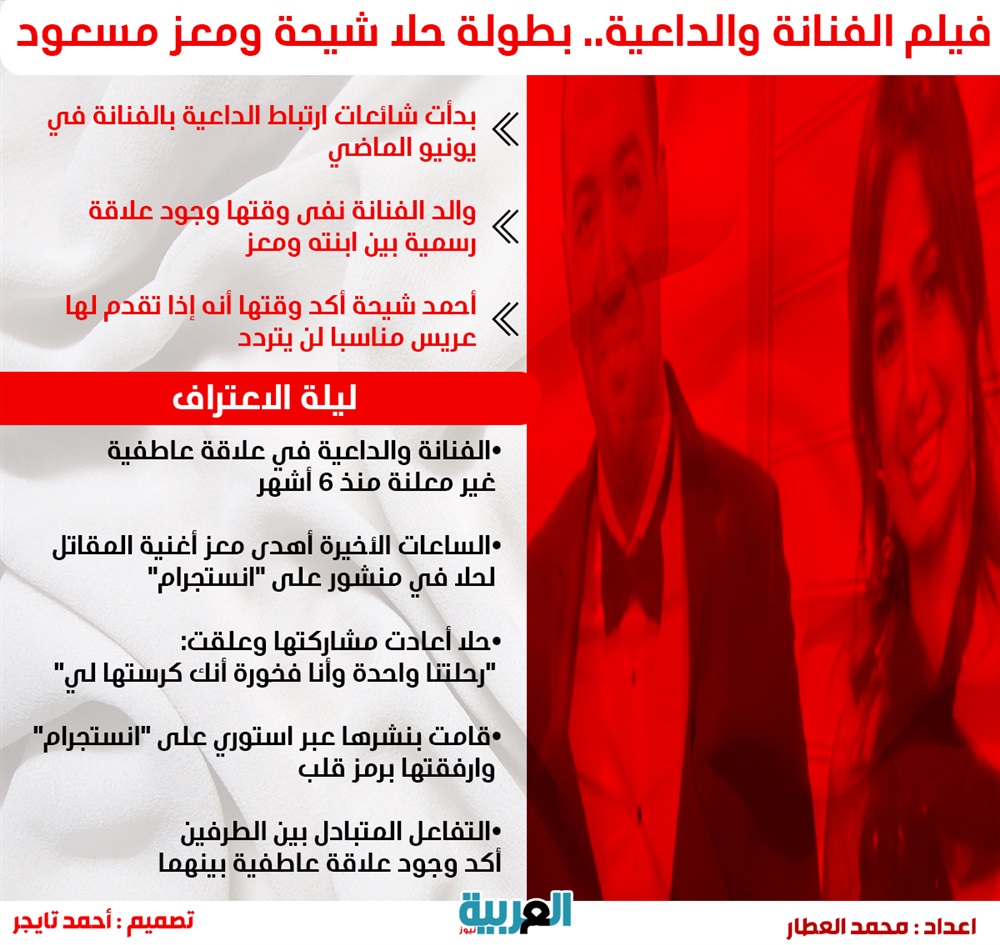فيلم الفنانة والداعية.. بطولة حلا شيحة ومعز مسعود "انفوجراف" الأربعاء 02/ديسمبر/2020 - 03:30 م 12/2/2020 3:30:55 PM إعداد: محمد العطار - تصميم: أحمد تايجر طرحت على الساحة خلال الساعات الأخيرة قصة حب الداعية الإسلامي معز مسعود والفنانة حلا شيحة بعد تعليقات متبادلة فيما بينهم على السوشيال ميديا.