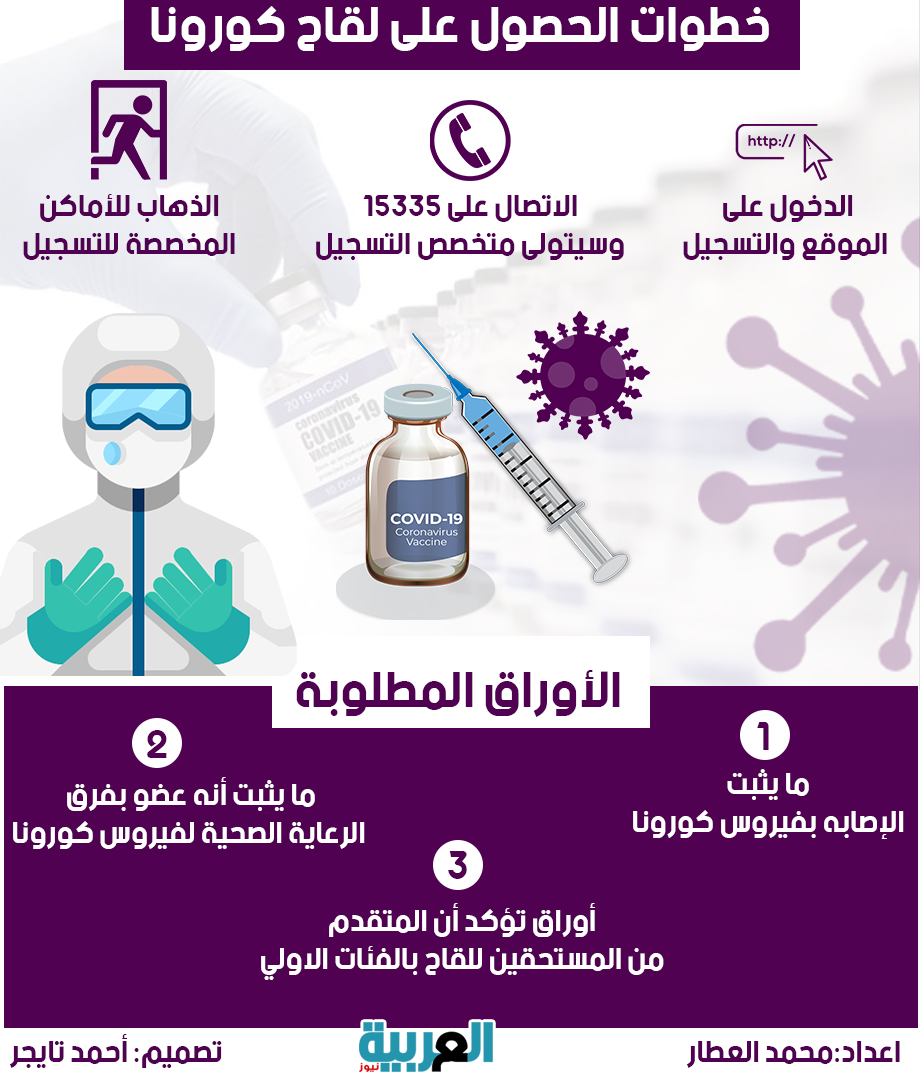 خطوات الحصول على لقاح كورونا "انفوجراف" السبت 23/يناير/2021 - 04:47 م 1/23/2021 4:47:39 PM إعداد: محمد العطار - تصميم: أحمد تايجر تفتح وزارة الصحة والسكان موقع التسجيل للحصول على لقاح فيروس كورونا التاجي المستجد، خلال الأسبوع المقبل، أمام المواطنين لطلب اللقاح.