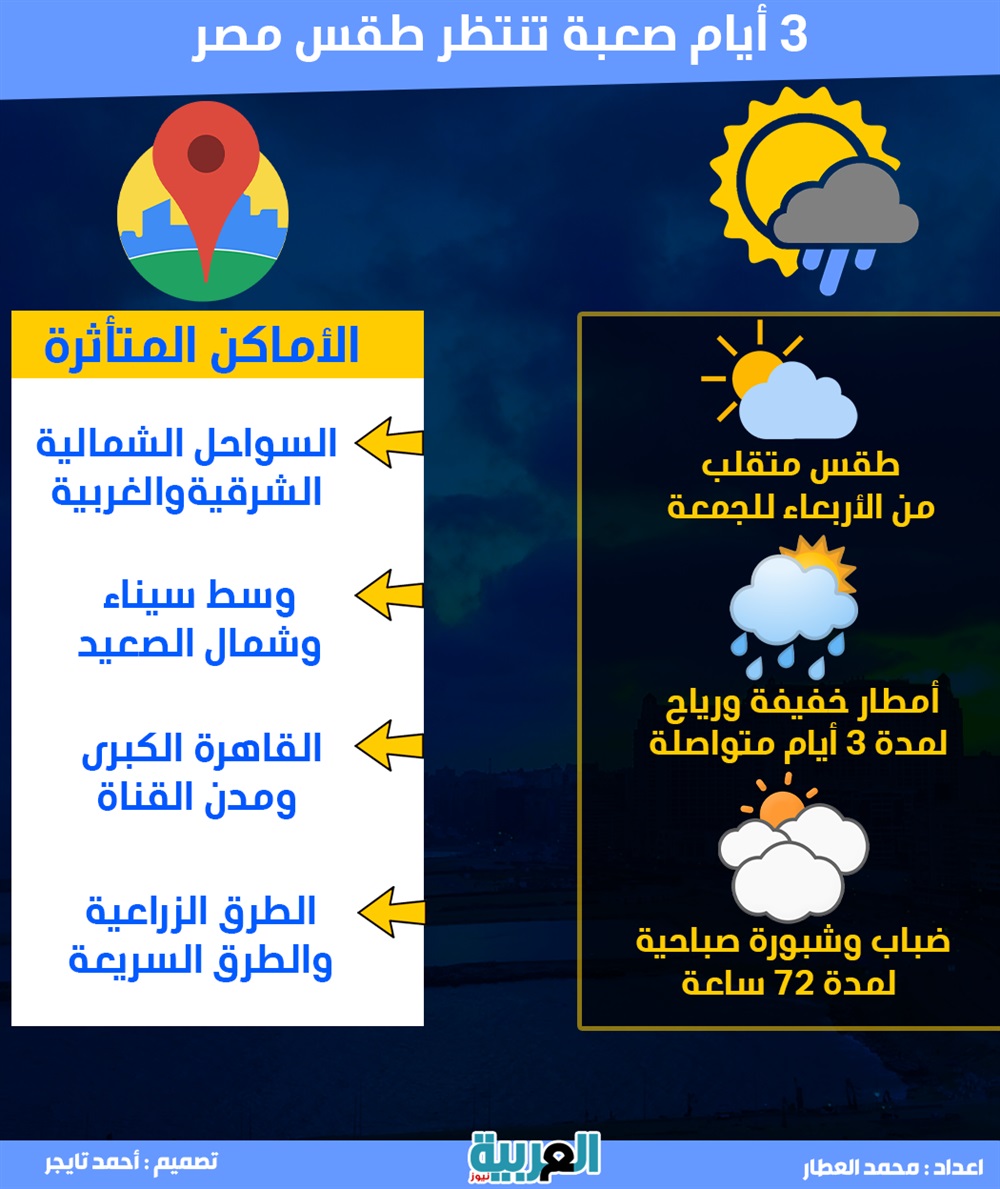 3 أيام صعبة تنتظر طقس مصر "انفوجراف" الثلاثاء 26/يناير/2021 - 03:31 م 1/26/2021 3:31:31 PM إعداد: محمد العطار - تصميم: أحمد تايجر صورة ارشيفية على مدار الأيام المقبلة تشهد مصر حالة من الطقس السئ الذي يضرب البلاد ويؤثر على كافة المحافظات.