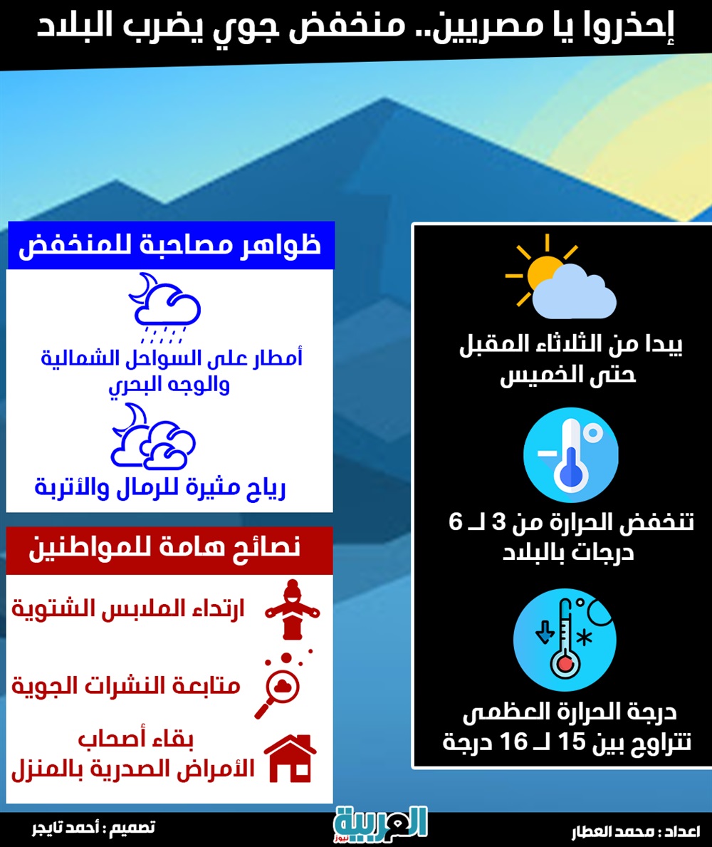 إحذروا يا مصريين.. منخفض جوي يضرب البلاد "انفوجراف" السبت 13/فبراير/2021 - 03:20 م 2/13/2021 3:20:26 PM إعداد: محمد العطار - تصميم: أحمد تايجر يضرب منخفض جوي البلاد خلال الفترة المقبلة، مما يؤثر بشكل كبير على حالة الطقس والمناخ المتوقعة في مصر.