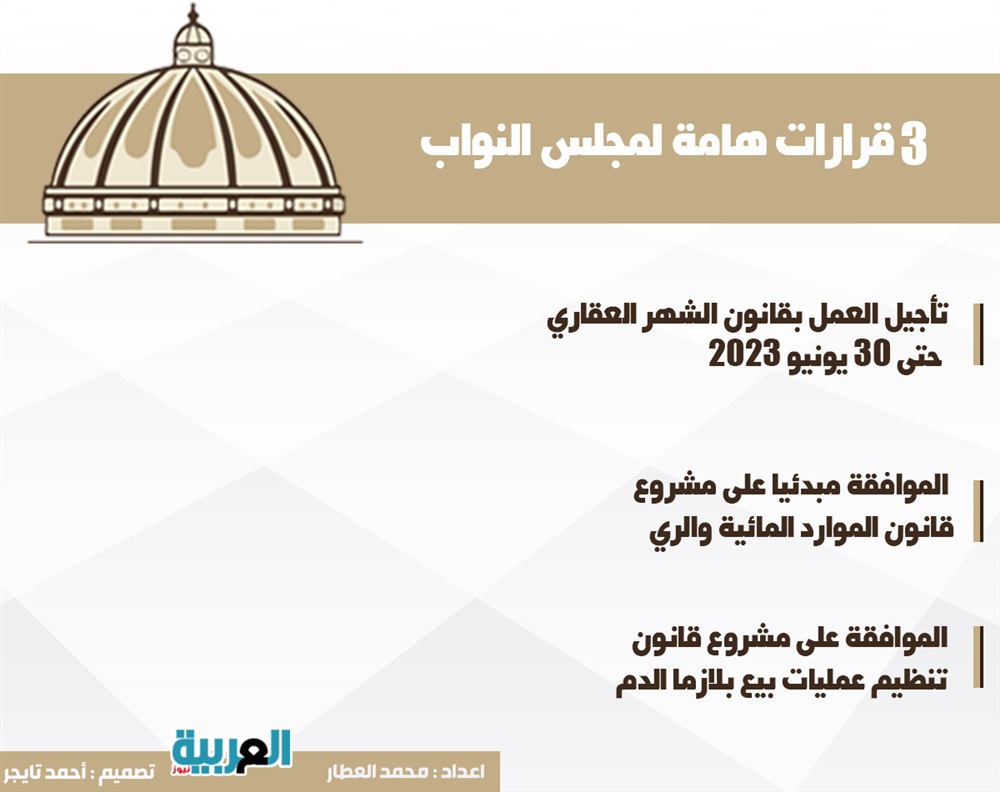 ٣ قرارات هامة لمجلس النواب "انفوجراف" الثلاثاء 02/مارس/2021 - 04:33 م 3/2/2021 4:33:40 PM إعداد: محمد العطار - تصميم: أحمد تايجر وافق مجلس النواب خلال جلسة اليوم الثلاثاء عدد من القرارات الهامة برئاسة المستشار حنفي الجبالي.