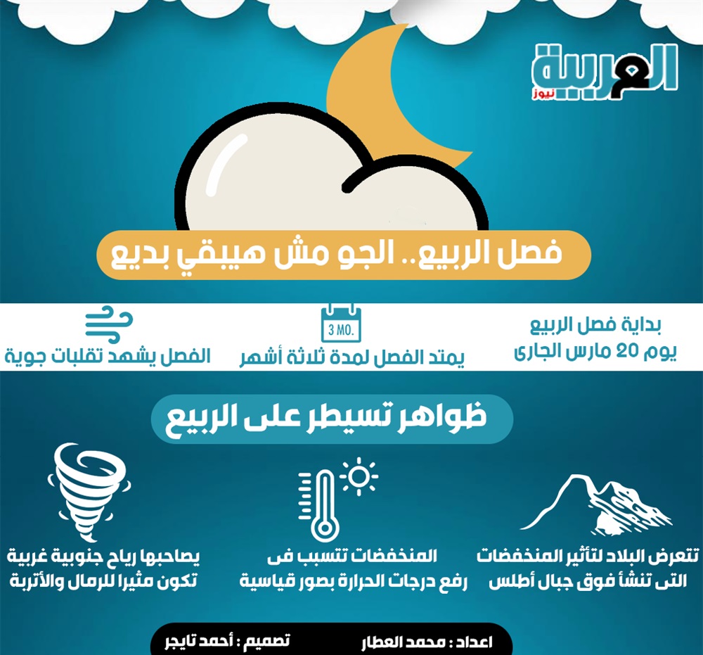 فصل الربيع.. الجو مش هيبقي بديع "انفوجراف" الأربعاء 17/مارس/2021 - 07:06 م 3/17/2021 7:06:47 PM إعداد: محمد العطار - تصميم: أحمد تايجر صورة ارشيفية في وقت ينتظر فيه المصريين قدوم فصل الربيع للتخلص من برد الشتاء، نجد أن هناك تحذيرات من الأرصاد الجوية بشأن الفصل.
