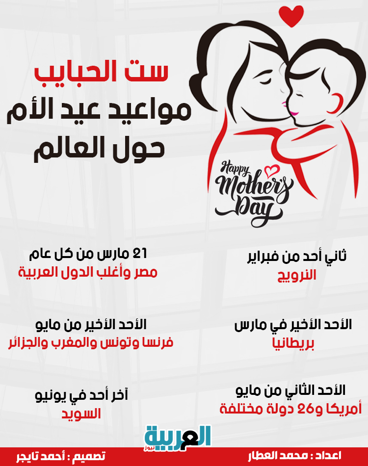 ست الحبايب.. مواعيد عيد الأم حول العالم "انفوجراف" السبت 20/مارس/2021 - 03:46 م 3/20/2021 3:46:38 PM إعداد: محمد العطار - تصميم: أحمد تايجر يختلف يوم الاحتفال بعيد الأم من دولة إلى آخرى فهو لا يتم الاحتفال به يوم ٢١ مارس فقط.وفي الانفوجراف الآتي يقدم "العربية نيوز" مواعيد الاحتفال بعيد الأم حول العالم: