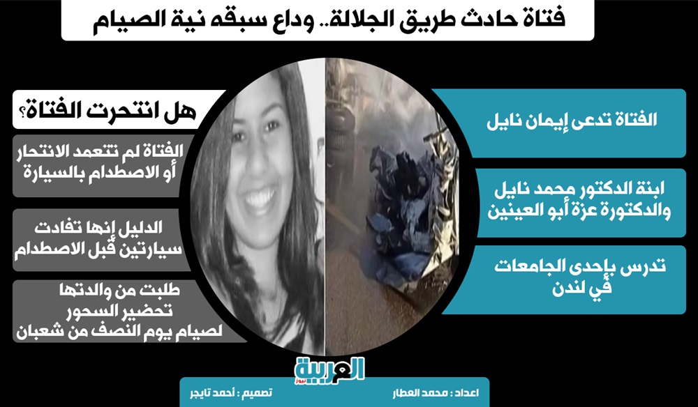 فتاة حادث طريق الجلالة.. وداع سبقه نية الصيام "انفوجراف" الإثنين 29/مارس/2021 - 03:16 م 3/29/2021 3:16:00 PM سيطر على السوشيال ميديا خلال الحادثة التي وقعت على طريق الجلاله بالسويس لفتاة تسير عكس الاتجاه فاصطدمت سيارتها الملاكي بسيارة نقل مما أدى إلى انفجار السيارة ووفاة الفتاة وتفحم جثتها.