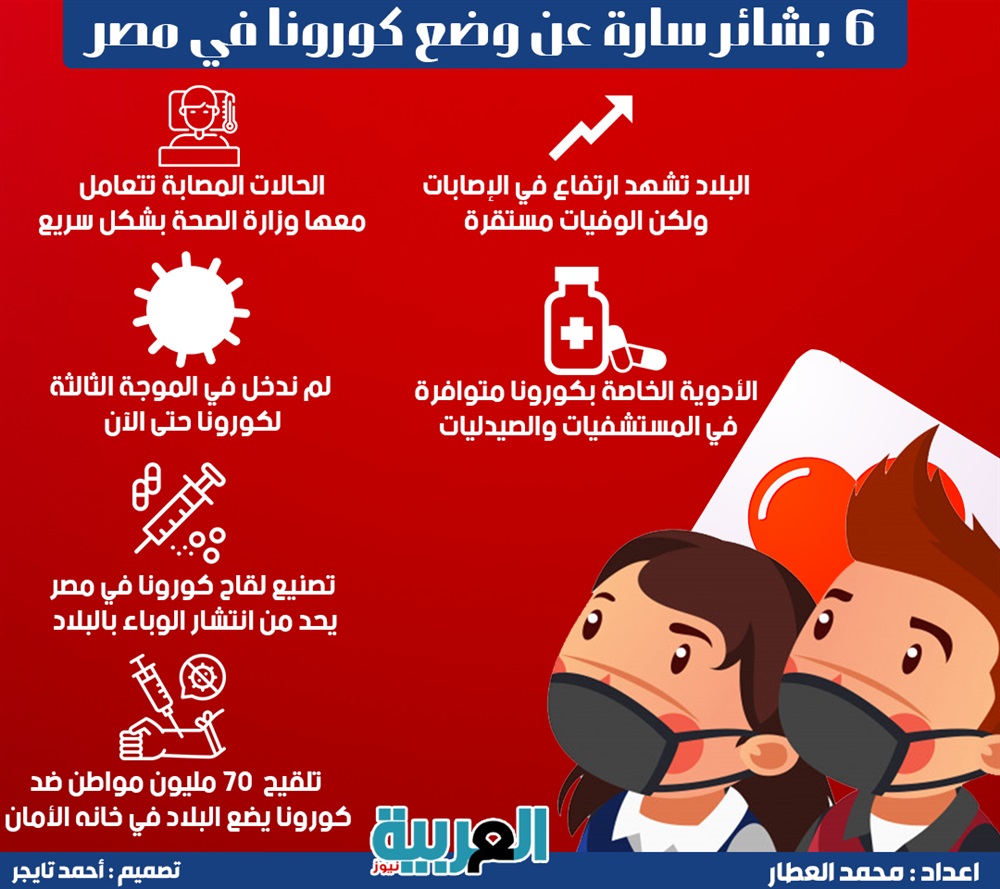 6 بشائر سارة عن وضع كورونا في مصر "انفوجراف" السبت 03/أبريل/2021 - 05:57 م 4/3/2021 5:57:28 PM إعداد: محمد العطار - تصميم: أحمد تايجر كشف عدد من المختصين في مصر عن بشائر سارة عن وضع فيروس كورونا بالبلاد، وسط ذعر المواطنين من زيادة الإصابات مؤخرا.