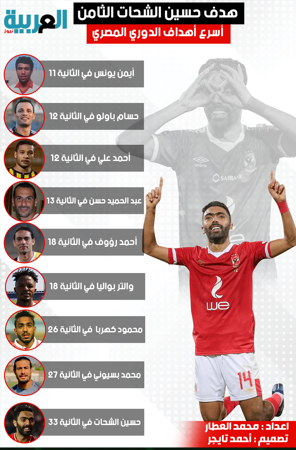 هدف حسين الشحات الثامن.. أسرع أهداف الدوري المصري "انفوجراف" الأحد 25/أبريل/2021 - 04:34 م 4/25/2021 4:34:53 PM إعداد: محمد العطار - تصميم: أحمد تايجر بتسجيل حسين الشحات هدف في الثانية ٣٣ بمرمى إنبي في الدوري، بدأ البعض يتذكر أسرع أهداف الدوري المصري.