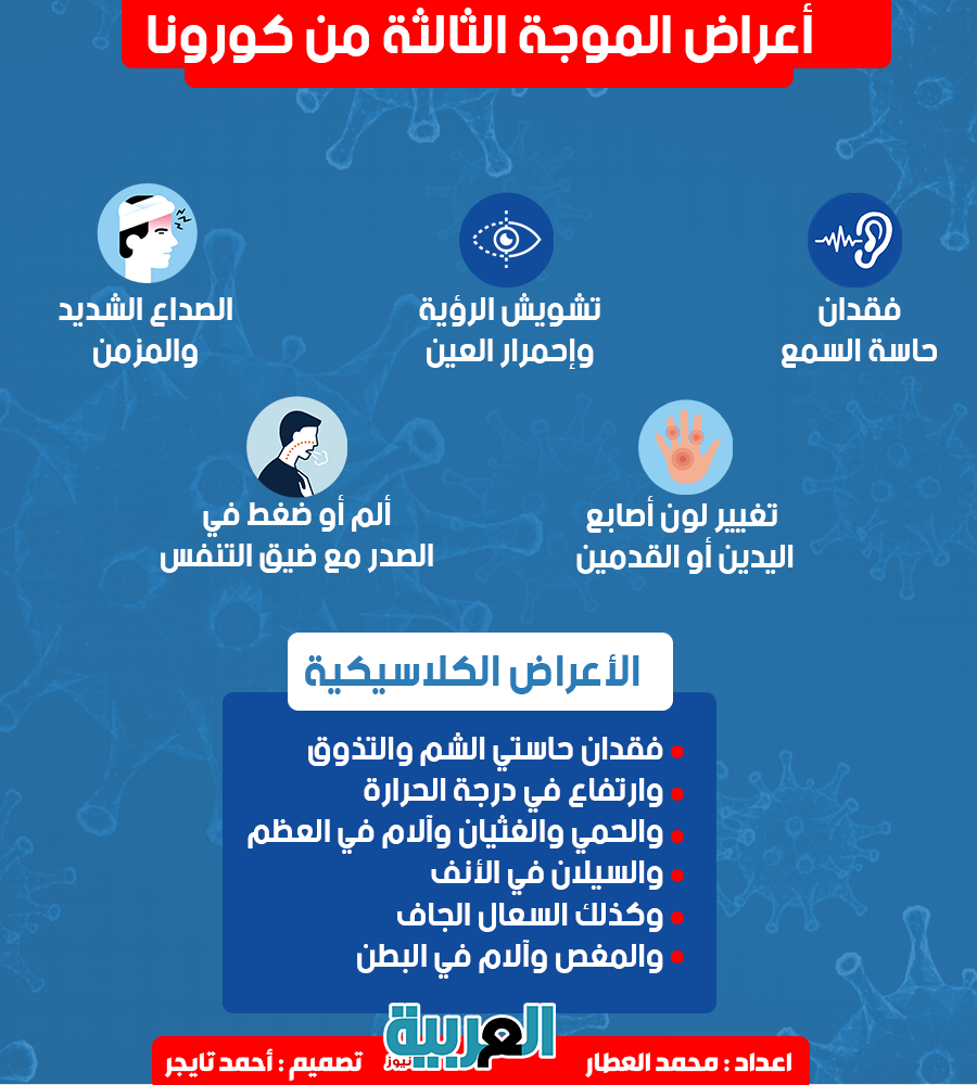 أعراض الموجة الثالثة من كورونا "انفوجراف" الأحد 02/مايو/2021 - 03:08 م 5/2/2021 3:08:24 PM إعداد: محمد العطار - تصميم: أحمد تايجر شهدت الموجة الثالثة لفيروس كورونا التاجي المستجد عدد من الأعراض المختلفة بشأن الوباء.