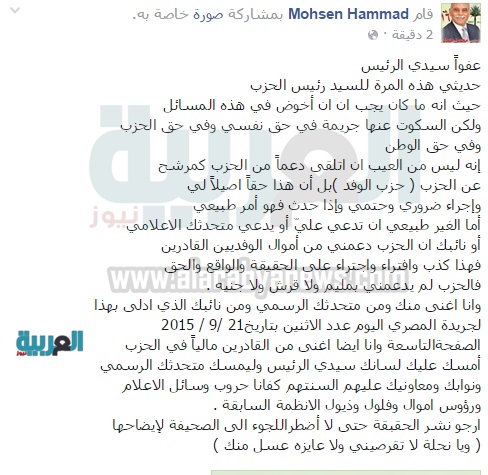 نفى محسن حماد، مرشح حزب الوفد بدائرة منتزه أول بالإسكندرية، ما صرح به المتحدث الرسمي للحزب "بهجت الحسامى"لإحدى الصحف الورقية، أن الحزب دعمه من أموال الوفديين القادرين لخوض الانتخابات البرلمانية القادمة، مؤكدًا أن هذا كذب واجتراء على الحقيقة، وأن الحزب لم يدعمه بمليم واحد.