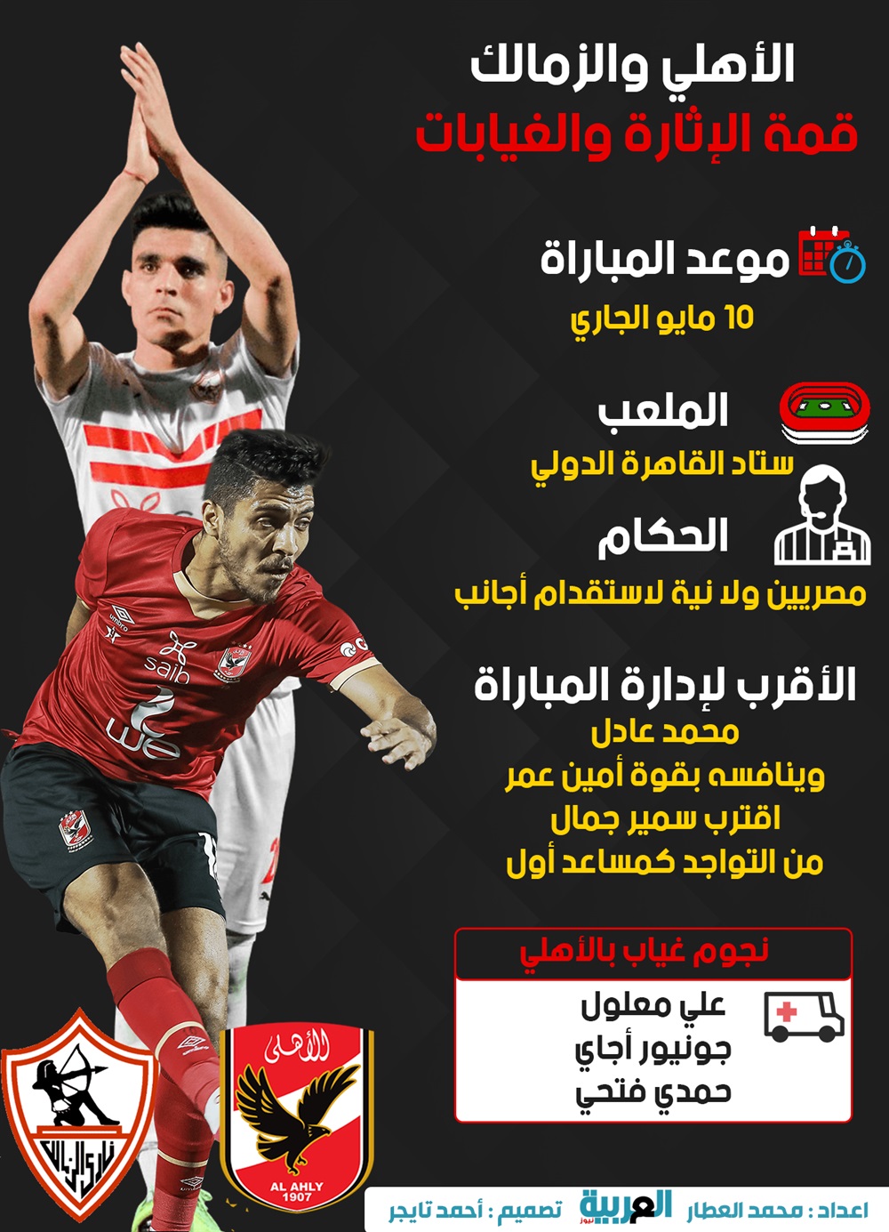 الأهلي والزمالك.. قمة الإثارة والغيابات "انفوجراف" الأربعاء 05/مايو/2021 - 03:51 م 5/5/2021 3:51:50 PM إعداد: محمد العطار - تصميم: أحمد تايجر حالة من الجدل أثيرت خلال الساعات الأخيرة بشأن مباراة القمة بين الأهلي والزمالك في الدوري المصري بسبب الاعتراضات على التحكيم ومطالب التأجيل.