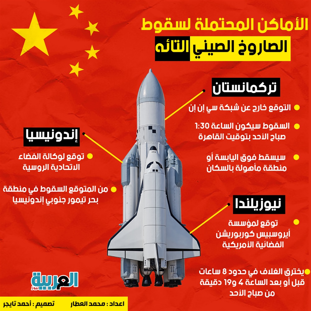 الأماكن المحتملة لسقوط الصاروخ الصيني التائه "انفوجراف" السبت 08/مايو/2021 - 03:34 م 5/8/2021 3:34:13 PM إعداد: محمد العطار - تصميم: أحمد تايجر حددت عدد من الجهات أماكن مختلفة لسقوط الصاروخ الصيني الخارج عن السيطرة خلال الساعات المقبلة.