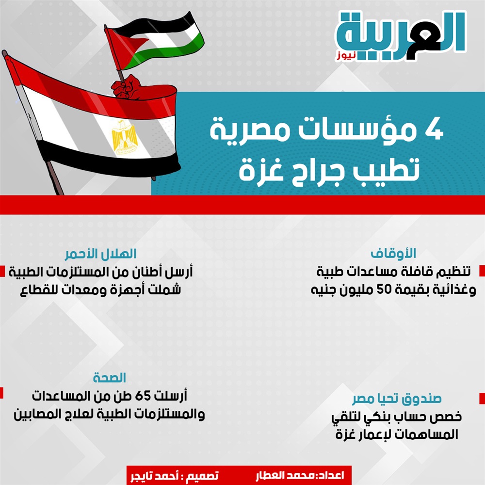 4 مؤسسات مصرية تطيب جراح غزة "انفوجراف" الأربعاء 19/مايو/2021 - 05:53 م 5/19/2021 5:53:47 PM إعداد: محمد العطار - تصميم: أحمد تايجر عملت عدد من الكيانات المصرية على دعم غزة خلال الساعات الأخيرة جراء القصف الإسرائيلي الذي تتعرض له فلسطين.