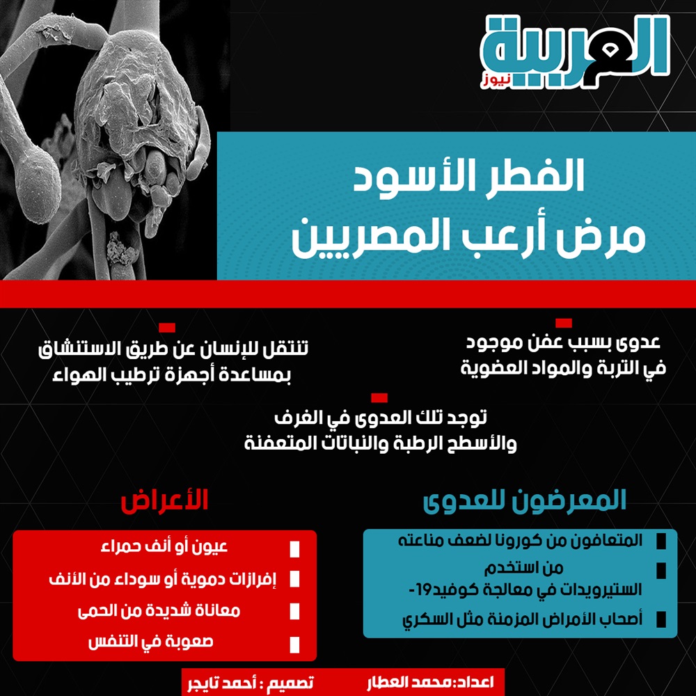 الفطر الأسود.. مرض أرعب المصريين "انفوجراف" السبت 22/مايو/2021 - 07:07 م 5/22/2021 7:07:54 PM إعداد: محمد العطار - تصميم: أحمد تايجر صورة ارشيفية انشغل المصريين خلال الساعات الأخيرة بمرض الفطر الأسود بعدما تم الإعلان عن أنه سبب في وفاة الفنان سمير غانم، بجانب انتشاره بشكل كبير في الهند.