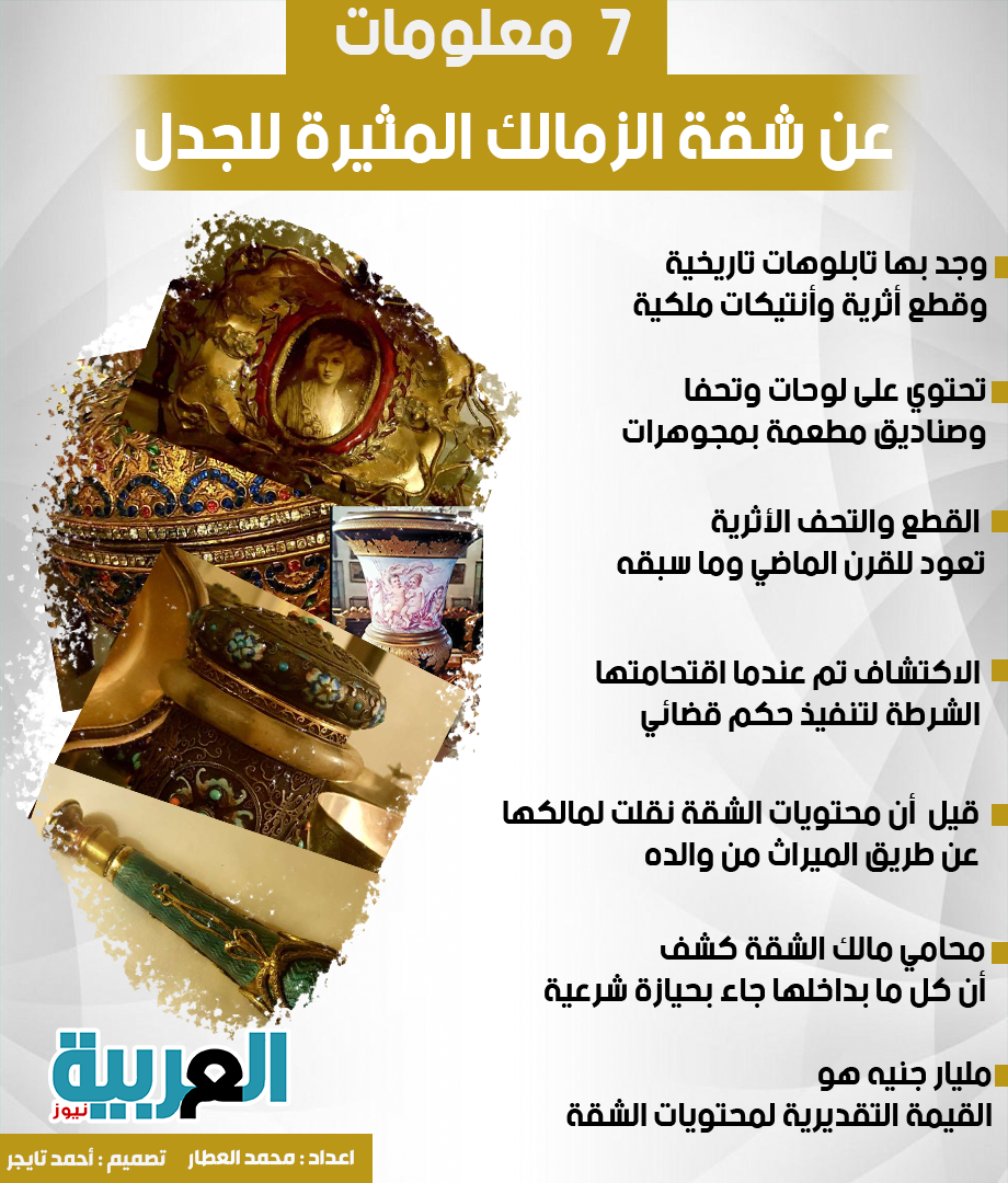 7 معلومات عن شقة الزمالك المثيرة للجدل "إنفوجراف" الثلاثاء 08/يونيو/2021 - 07:14 م 6/8/2021 7:14:28 PM إعداد: محمد العطار - تصميم: أحمد تايجر أثارت شقة بالزمالك الجدل خلال الساعات الأخيرة بعد العثور على مقتنيات ذهبية بداخلها.