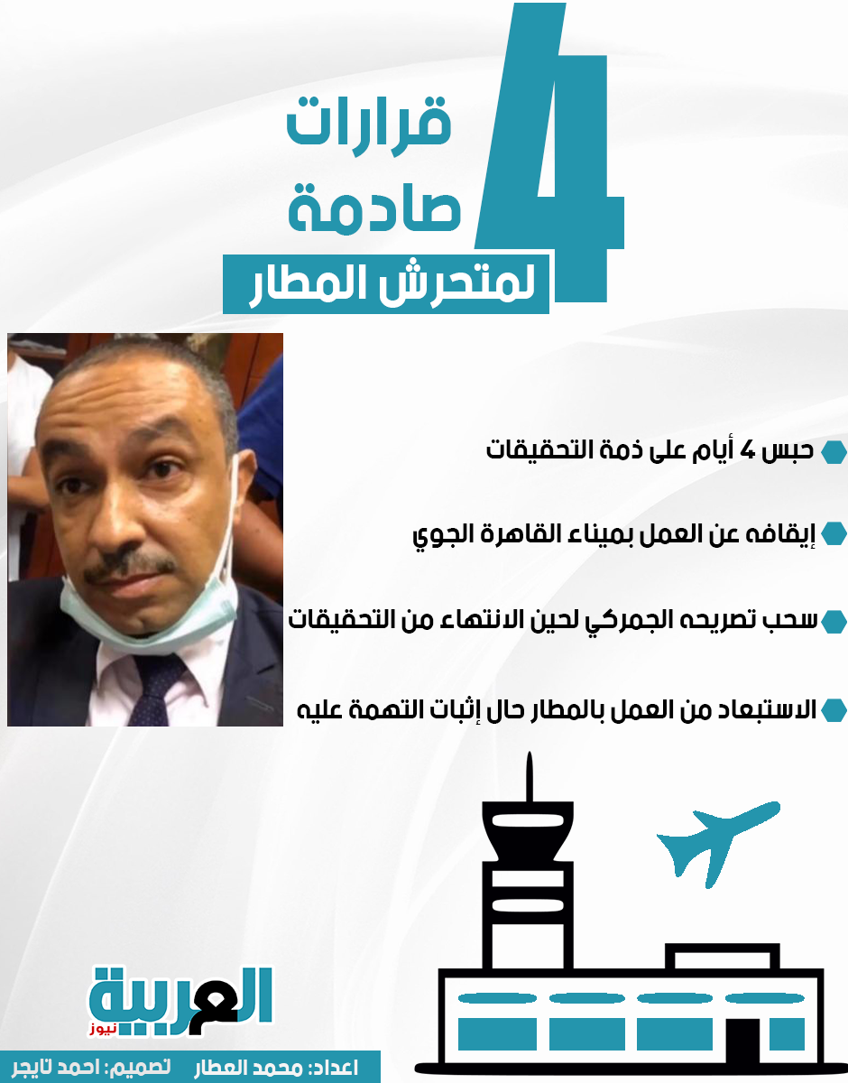 4 قرارات صادمة لمتحرش المطار "إنفوجراف" الأربعاء 16/يونيو/2021 - 05:48 م 6/16/2021 5:48:02 PM إعداد: محمد العطار - تصميم: أحمد تايجر سيطرت واقعة متحرش المطار على السوشيال ميديا خلال الساعات الأخيرة، بعدما ألقي القبض عليه لتصويره فتاة من الخلف داخل مطار القاهرة.