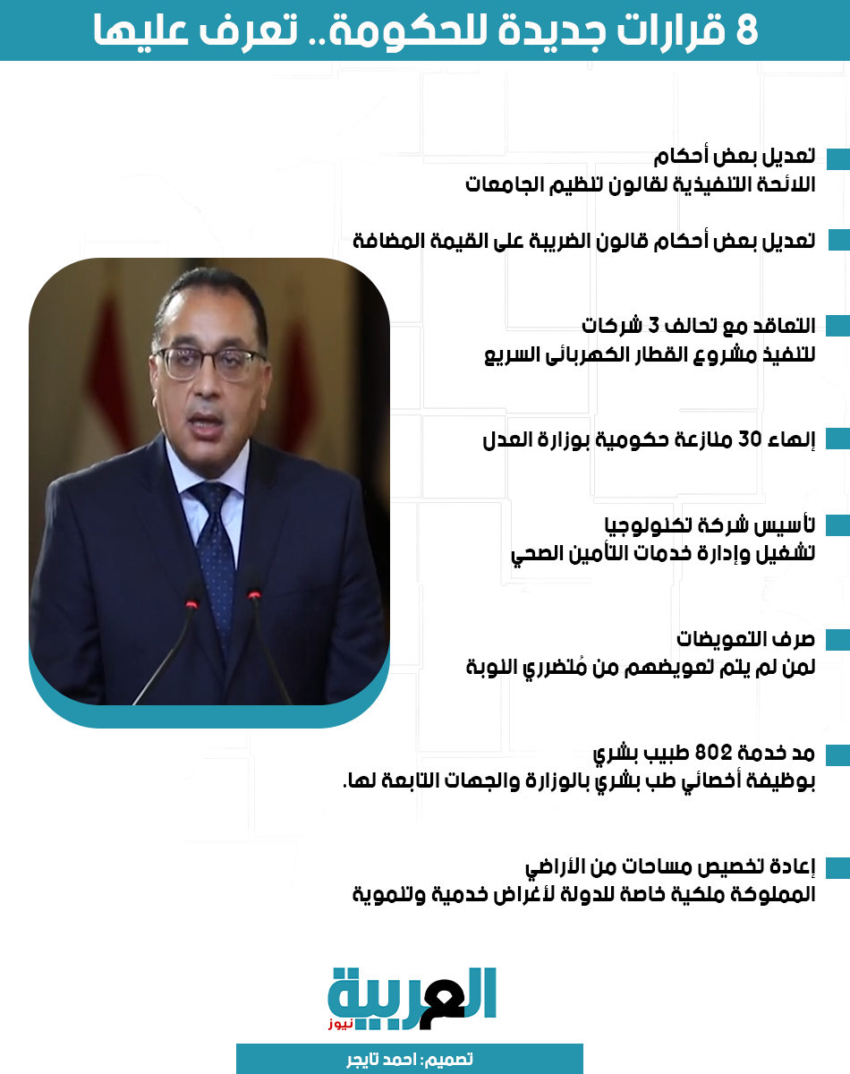 8 قرارات جديدة للحكومة.. تعرف عليها (انفوجراف) الأربعاء 23/يونيو/2021 - 07:49 م 6/23/2021 7:49:48 PM تصميم: أحمد تايجر وافق مجلس الوزراء، برئاسة الدكتور مصطفى مدبولي، على العديد من القرارات اليوم الأربعاء.وإليكم تلك القرارات على النحو التالي: