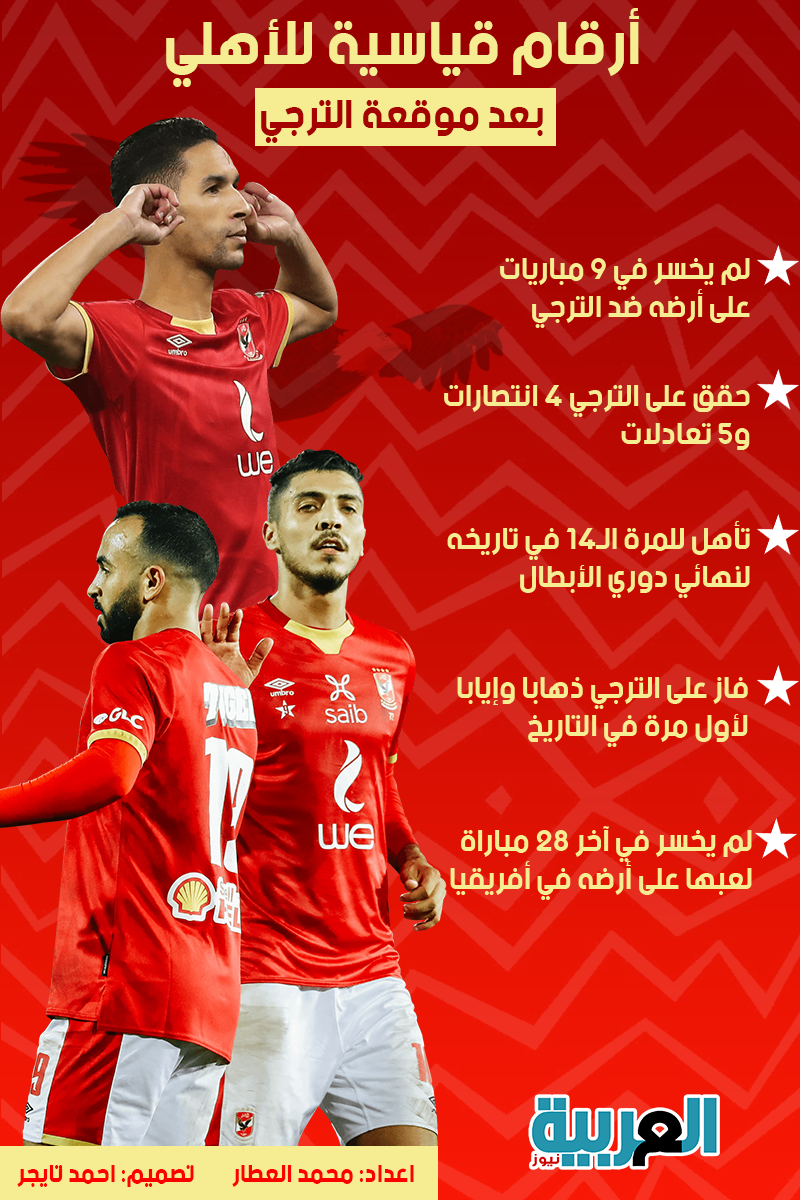أرقام قياسية للأهلي بعد موقعة الترجي "إنفوجراف" الأحد 27/يونيو/2021 - 04:03 م 6/27/2021 4:03:00 PM إعداد: محمد العطار - تصميم: أحمد تايجر حقق النادي الأهلي عدد من الأرقام القياسية بعد فوزه بثلاثية على الترجي التونسي في إياب نصف نهائي دوري أبطال أفريقيا.