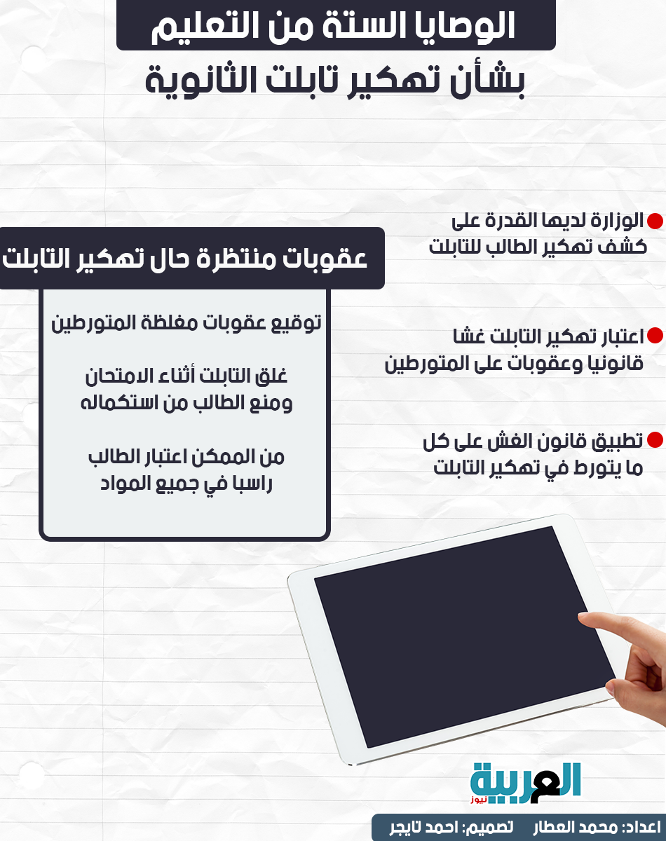 الوصايا الستة من التعليم بشأن تهكير تابلت الثانوية "إنفوجراف" الإثنين 05/يوليو/2021 - 06:00 م 7/5/2021 6:00:55 PM إعداد: محمد العطار - تصميم: أحمد تايجر وجهت وزارة التربية والتعليم خلال الفترة الأخيرة عدد من التحذيرات بشأن محاولات تهكير تابلت الثانوية العامة.