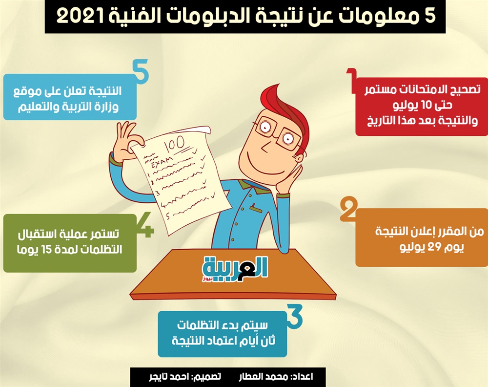 5 معلومات عن نتيجة الدبلومات الفنية 2021 "إنفوجراف" الثلاثاء 06/يوليو/2021 - 06:11 م 7/6/2021 6:11:08 PM إعداد: محمد العطار - تصميم: أحمد تايجر صورة ارشيفية شغلت نتيجة الدبلومات الفنية عدد من الطلاب وأولياء الأمور خلال الساعات الأخيرة، مما جعلها تتصدر مؤشرات موقع جوجل.