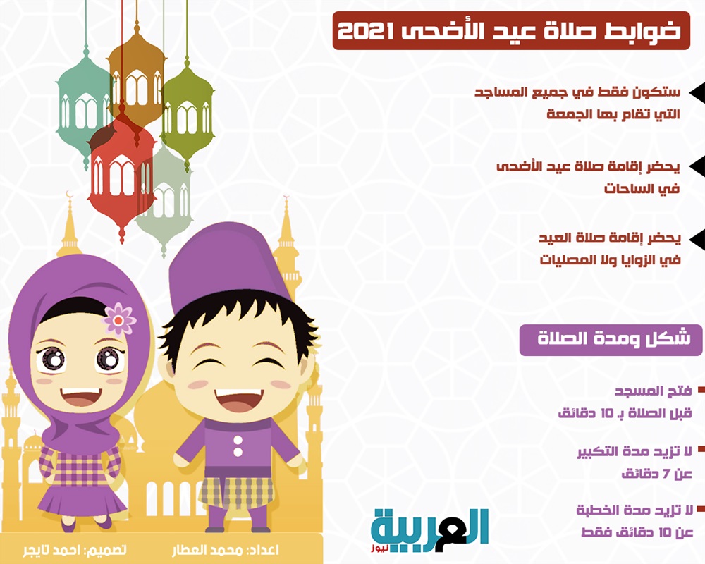 ضوابط صلاة عيد الأضحى 2021 "إنفوجراف" الإثنين 19/يوليو/2021 - 04:49 م 7/19/2021 4:49:40 PM إعداد: محمد العطار - تصميم: أحمد تايجر وضعت وزارة الأوقاف عدد من الضوابط بشأن صلاة عيد الأضحى 2021 الذي يؤديها المسلمين خلال الساعات المقبلة.