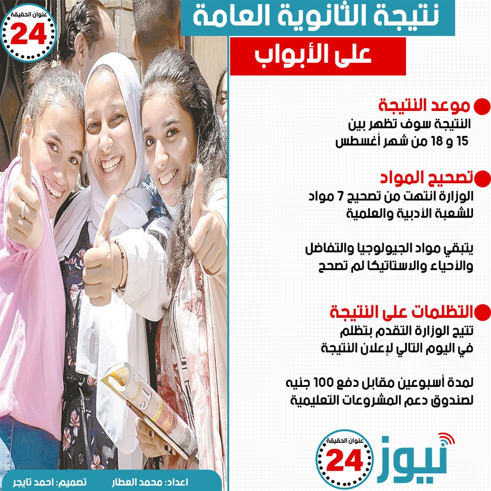 نتيجة الثانوية العامة على الأبواب "إنفوجراف" الأربعاء 04/أغسطس/2021 - 07:24 م 8/4/2021 7:24:18 PM إعداد: محمد العطار - تصميم: أحمد تايجر قاربت نتيجة الثانوية العامة على الظهور خلال الأسابيع المقبلة، وفقا لما تم الإعلان عنه من قبل المسئولين بوزارة التربية والتعليم.