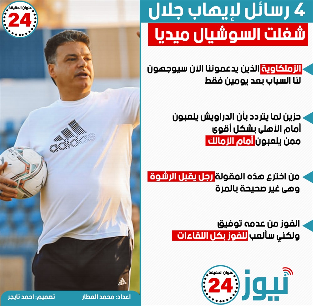4 رسائل لإيهاب جلال شغلت السوشيال ميديا "إنفوجراف" الخميس 12/أغسطس/2021 - 06:43 م 8/12/2021 6:43:05 PM إعداد: محمد العطار - تصميم: أحمد تايجر أدلى المدير الفني لنادي الاسماعيلي عدد من الرسائل الهامة عقب تعادل الدراويش مع الأهلي بالدوري المصري.