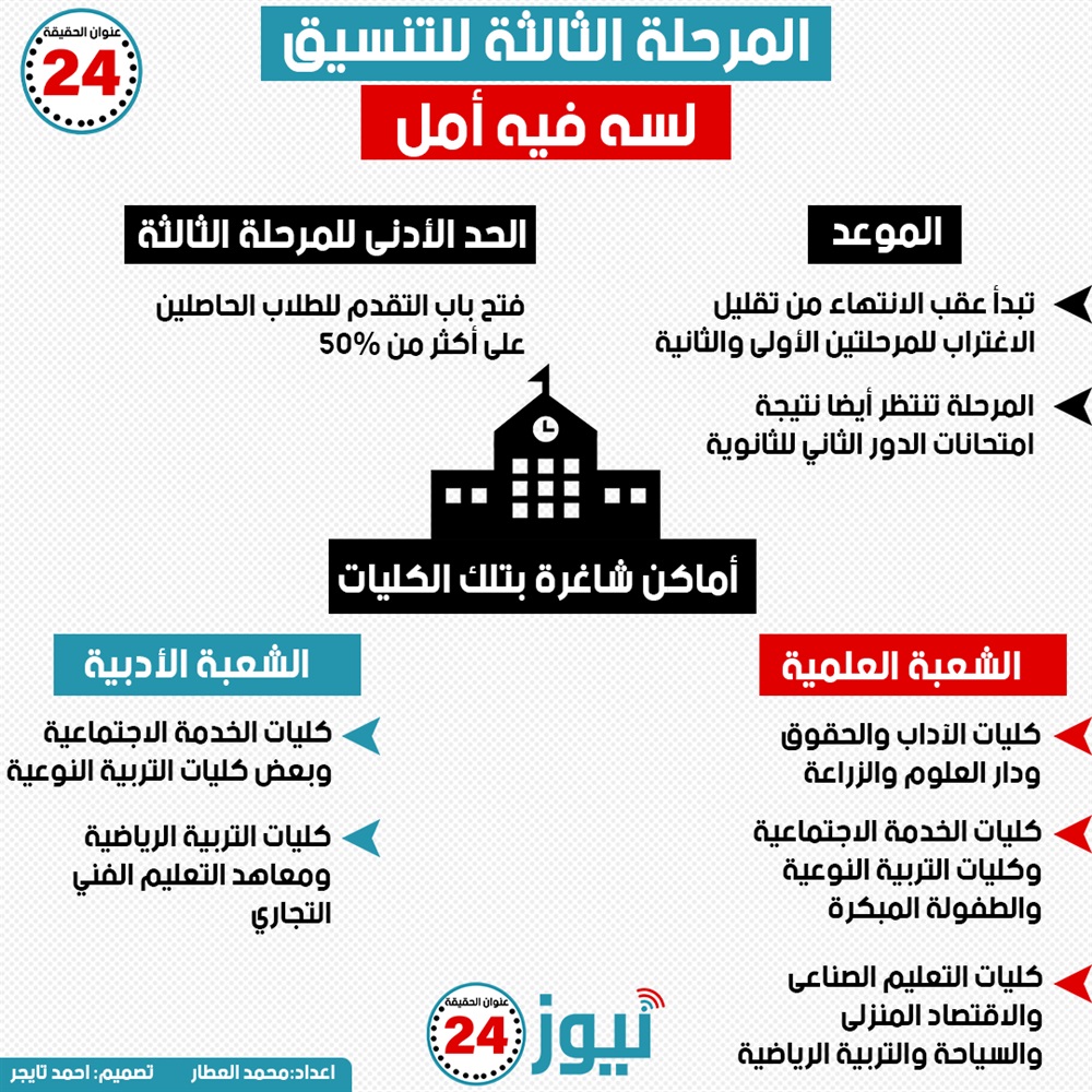 المرحلة الثالثة للتنسيق "لسه فيه أمل".. إنفوجراف الإثنين 06/سبتمبر/2021 - 07:19 م 9/6/2021 7:19:04 PM إعداد: محمد العطار - تصميم: أحمد تايجر صورة ارشيفية كشفت وزارة التعليم العالي والبحث العلمي عن عدة معلومات هامة بشأن المرحلة الثالثة من تنسيق القبول بالجامعات ووجود فرص للطلاب بالكليات.