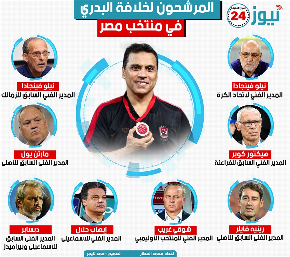 المرشحون لخلافة "البدري" في منتخب مصر.. "إنفوجراف" الثلاثاء 07/سبتمبر/2021 - 06:56 م 9/7/2021 6:56:14 PM إعداد: محمد العطار - تصميم: أحمد تايجر في الساعات الأخيرة، أقال إتحاد الكرة حسام البدري من الإدارة الفنية لمنتخب مصر لتبدأ رحلة البحث على مدير فني جديد.