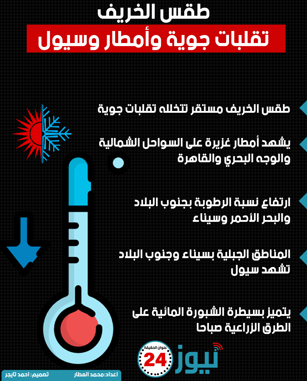 طقس الخريف.. تقلبات جوية وأمطار وسيول "إنفوجراف" الإثنين 20/سبتمبر/2021 - 04:58 م 9/20/2021 4:58:05 PM إعداد: محمد العطار - تصميم: أحمد تايجر كشفت هيئة الأرصاد الجوية عن ملامح طقس فصل الخريف الذي ينتظره المصريين في 22 سبتمبر الجاري.