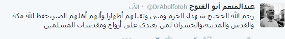 حيث غرد أبو الفتوح، على موقع التدوين العالمي "تويتر": "رحم الله شهداء الحرم، وتقبلهم أطهارا وألهم أهلهم الصبر، وحفظ مكة والقدس والمدينة، والخسران لمن يعتدي على أرواح ومقدسات المسلمين.