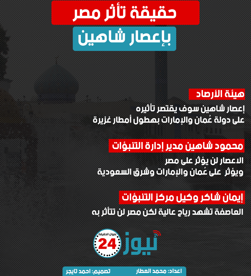 حقيقة تأثر مصر بإعصار شاهين "إنفوجراف" الأحد 03/أكتوبر/2021 - 08:12 م 10/3/2021 8:12:40 PM إعداد: محمد العطار - تصميم: أحمد تايجر صورة ارشيفية كشفت عدد التصريحات حقيقة تأثر مصر بإعصار شاهين الذي يضرب دول الخليج خلال الفترة الحالية.
