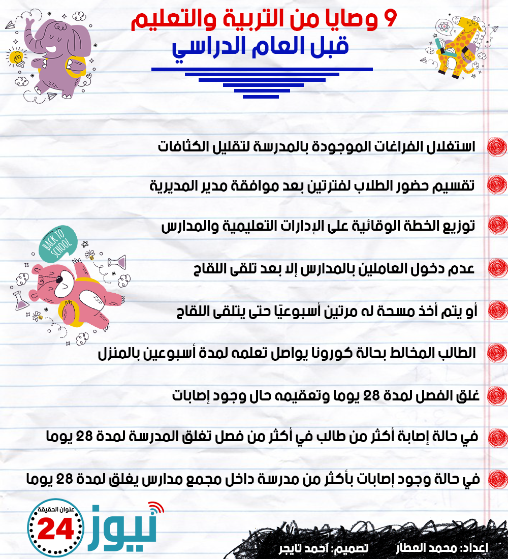 9 وصايا من التربية والتعليم قبل العام الدراسي "إنفوجراف" الأربعاء 06/أكتوبر/2021 - 06:09 م 10/6/2021 6:09:31 PM إعداد: محمد العطار - تصميم: أحمد تايجر أصدرت وزارة التربية والتعليم عدد من القرارت الهامة بشأن العام الدراسي الجديد خاصة لمواجهة فيروس كورونا.