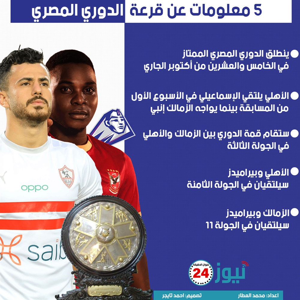 5 معلومات عن قرعة الدوري المصري.. "إنفوجراف" الثلاثاء 12/أكتوبر/2021 - 05:06 م 10/12/2021 5:06:42 PM إعداد: محمد العطار - تصميم: أحمد تايجر أجريت قرعة الدوري المصري الممتاز الجديد وأسفرت عن العديد من المفاجآت.