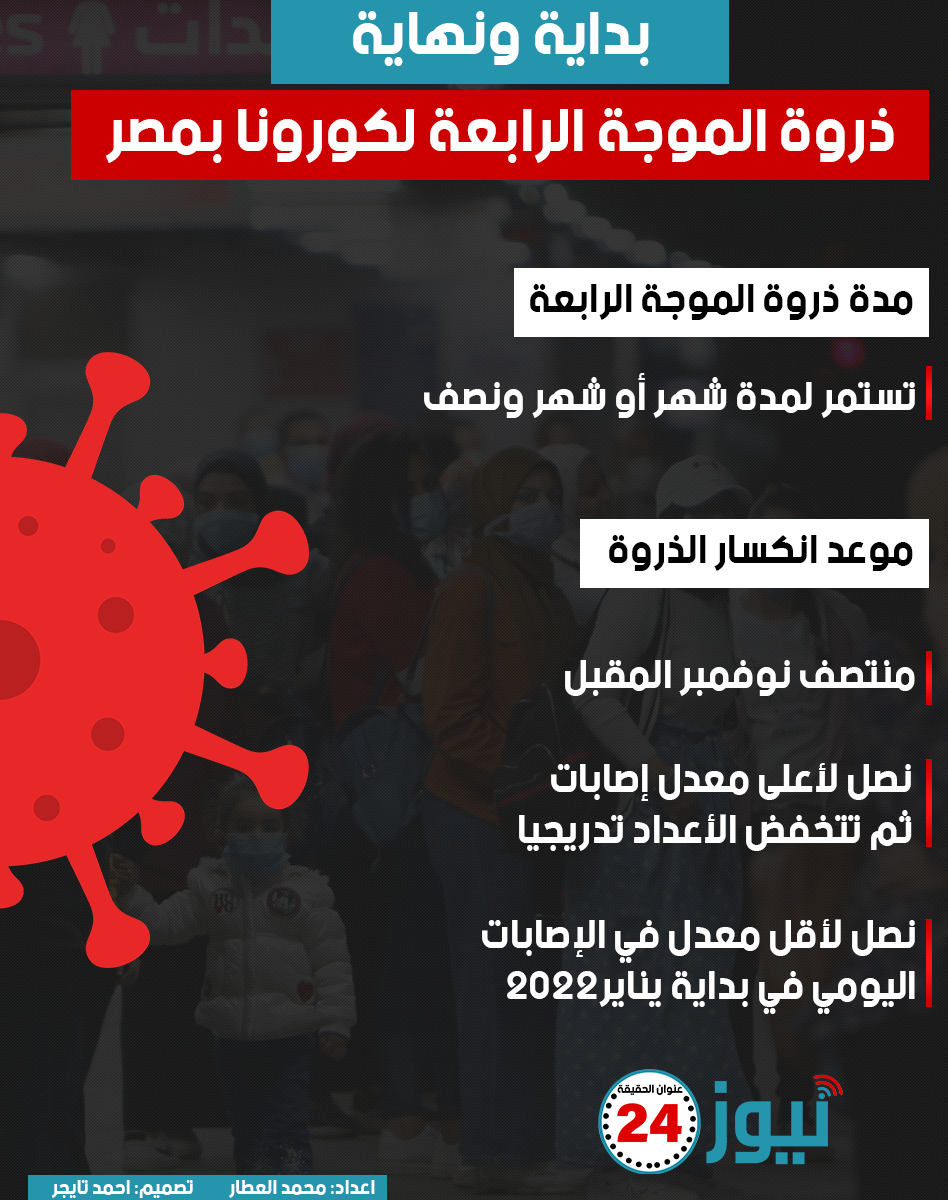 بداية ونهاية ذروة الموجة الرابعة لكورونا بمصر "إنفوجراف" الأحد 24/أكتوبر/2021 - 07:58 م 10/24/2021 7:58:57 PM إعداد: محمد العطار - تصميم: أحمد تايجر ينشغل الرأي العام المصري خلال الفترة الحالية بالموجة الرابعة لفيروس كورونا وذروتها بسبب الخوف من زيادة الإصابات.