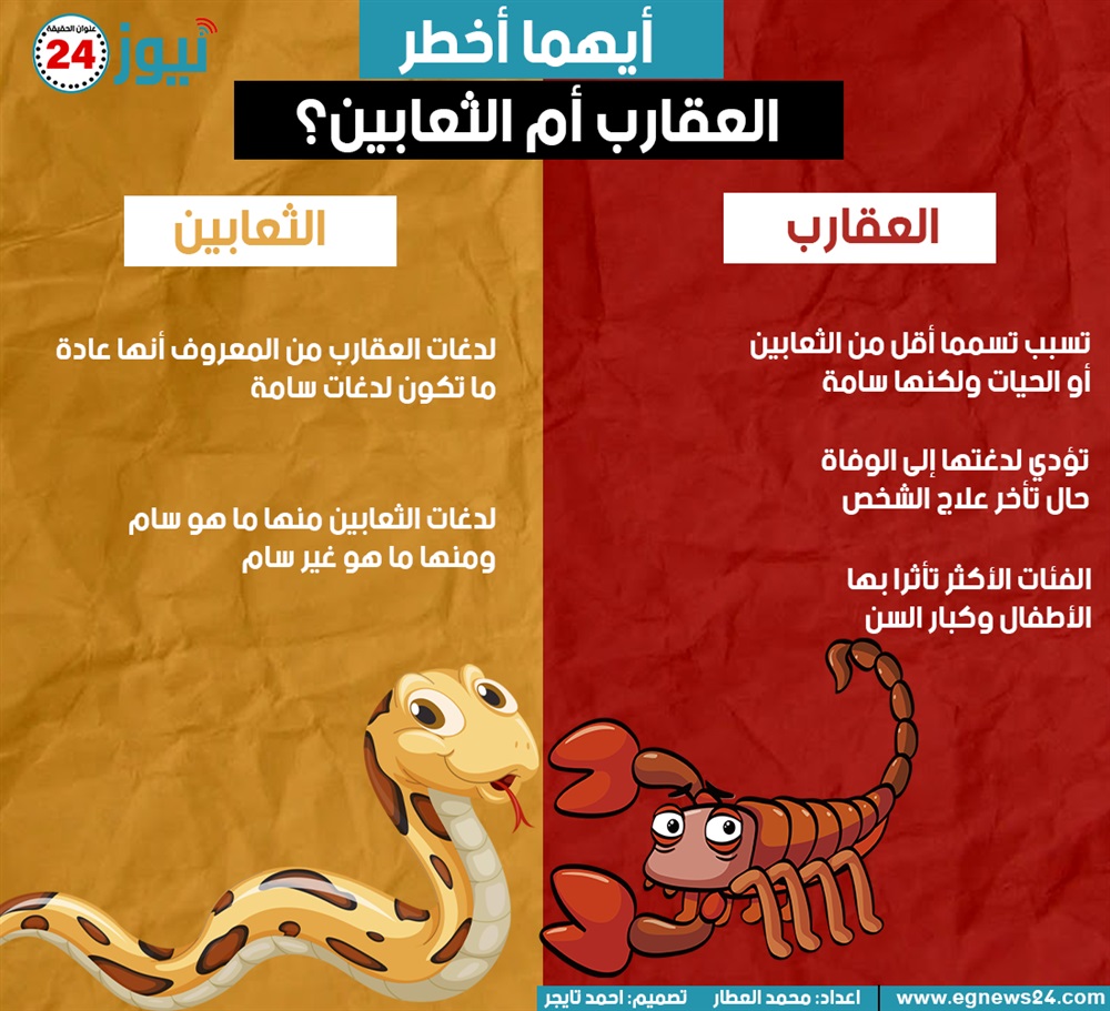 أيهما أخطر.. العقارب أم الثعابين؟ "إنفوجراف" الأحد 14/نوفمبر/2021 - 06:38 م 11/14/2021 6:38:55 PM إعداد: محمد العطار - تصميم: أحمد تايجر بعد الهجوم الذي تعرضت له محافظة أسوان من الثعابين والعقارب جراء ضرب السيول للمحافظة بدأ البعض يتسائل عن الفرق بين العقارب والثعابين.