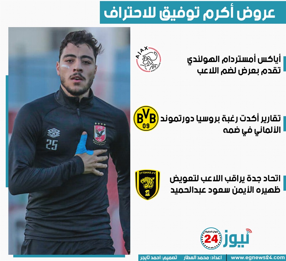 عروض أكرم توفيق للاحتراف.. "إنفوجراف" الخميس 18/نوفمبر/2021 - 06:32 م 11/18/2021 6:32:18 PM إعداد: محمد العطار - تصميم: أحمد تايجر بعد تألقه بشكل لافت مع النادي الأهلي ومنتخب مصر، تلقى أكرم توفيق عدد من العروض من أجل الإحتراف خارج مصر.