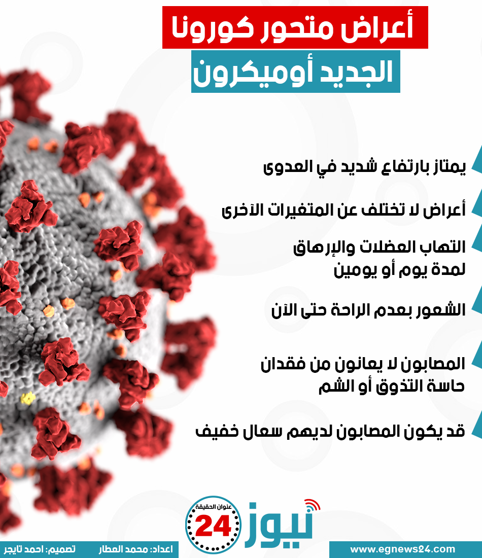 أعراض متحور كورونا الجديد أوميكرون.. "إنفوجراف" الأحد 28/نوفمبر/2021 - 05:52 م 11/28/2021 5:52:47 PM إعداد: محمد العطار - تصميم: أحمد تايجر كشف عدد من المختصون عن أعراض متحوركورونا الجديد الذي أطلقت عليه منظمة الصحة العالمية لقب "أوميكرون".