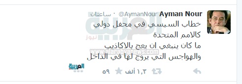 وكتب "نور" فى تغريدة له على موقع التواصل الاجتماعى "تويتر" قائلاً: "خطاب السيسي في محفل دولي كالأمم المتحدة ما كان ينبغي أن يعج بالأكاذيب والهواجس التي يروج لها في الداخل".