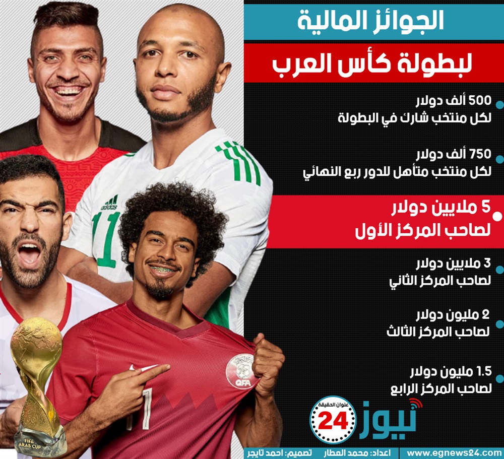 الجوائز المالية لبطولة كأس العرب.. "إنفوجراف" الأحد 12/ديسمبر/2021 - 04:57 م 12/12/2021 4:57:52 PM إعداد: محمد العطار - تصميم: أحمد تايجر بعد تأهل منتخب مصر لنصف نهائي كأس العرب المقام في قطر بدأ المصريون يبحثون عن الجوائز المالية لتلك المسابقة.