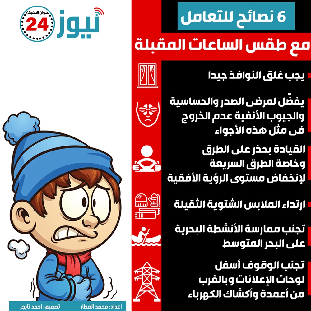 6 نصائح للتعامل مع طقس الساعات المقبلة.. "إنفوجراف" الأحد 19/ديسمبر/2021 - 09:30 م 12/19/2021 9:30:09 PM إعداد: محمد العطار - تصميم: أحمد تايجر صورة ارشيفية وجهت هيئة الأرصاد الجوية عدد من النصائح للتعامل مع طقس الساعات المقبلة الذي يشهد رياح وموجة من الأتربة.