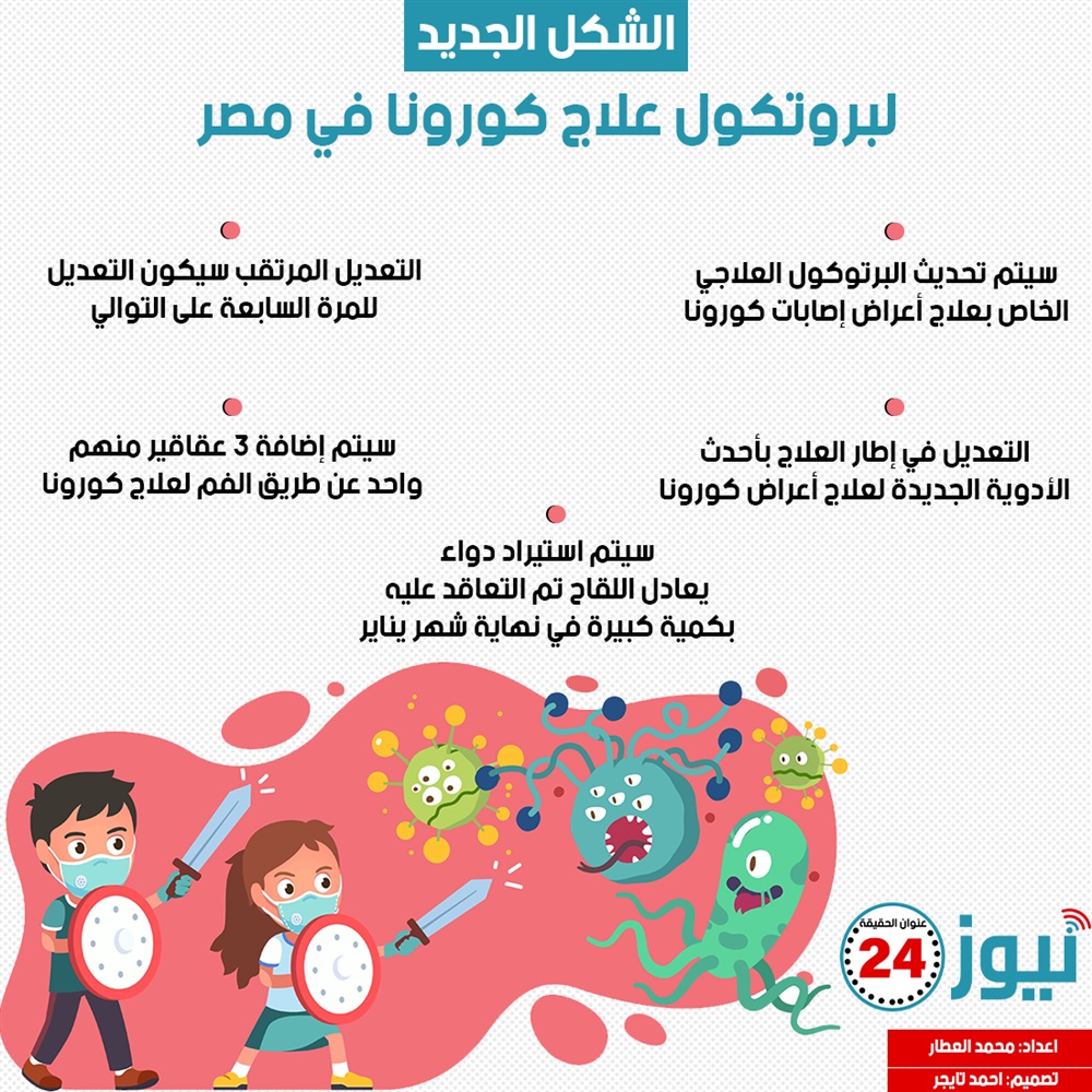 الشكل الجديد لبروتكول علاج كورونا في مصر.. "إنفوجراف" الأربعاء 12/يناير/2022 - 05:41 م 1/12/2022 5:41:47 PM إعداد: محمد العطار - تصميم: أحمد تايجر يشهد البروتوكول الخاص بعلاج اصابات فيروس كورونا في مصر تعديلات خلال الفتره المقبله ضمن إجراءات وزارة الصحة لمواجهه ذلك الوباء.