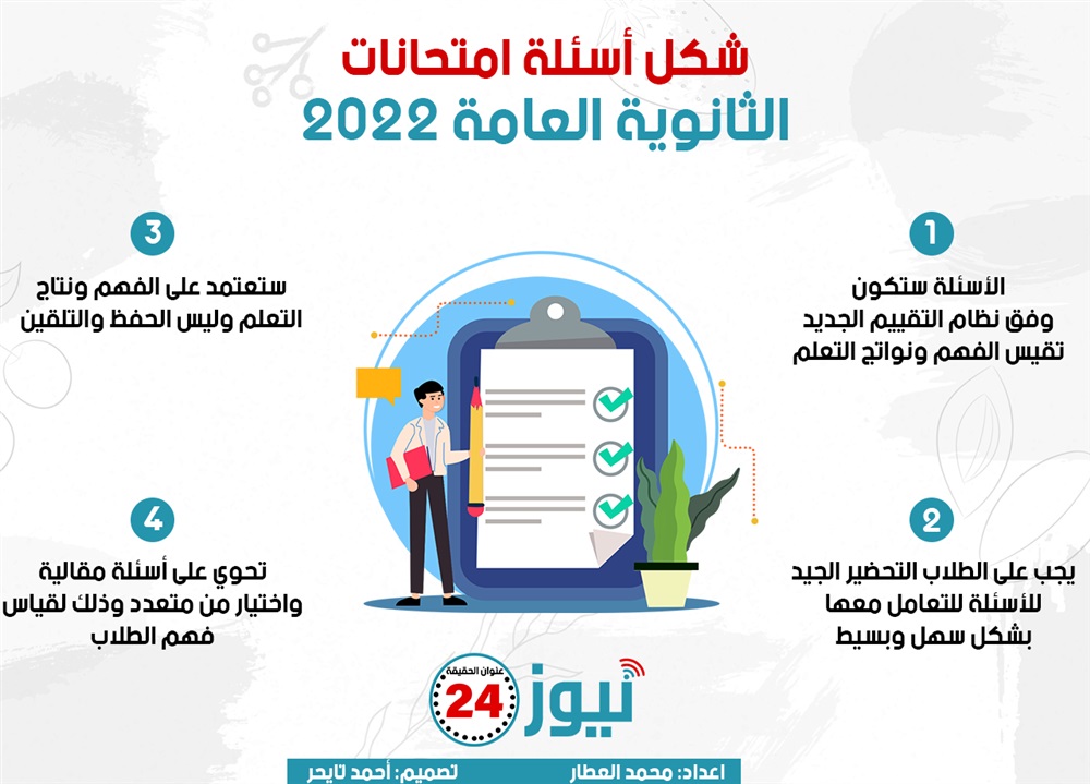 شكل أسئلة امتحانات الثانوية العامة 2022 .. "إنفوجراف" الخميس 03/مارس/2022 - 04:43 م 3/3/2022 4:43:02 PM إعداد: محمد العطار - تصميم: أحمد تايجر بدأت ملامح شكل أسئلة امتحانات الثانوية العامة 2022 تظهر خلال الفترة الأخيرة، وفق التقارير التي صدرت عن وزارة التربية والتعليم.