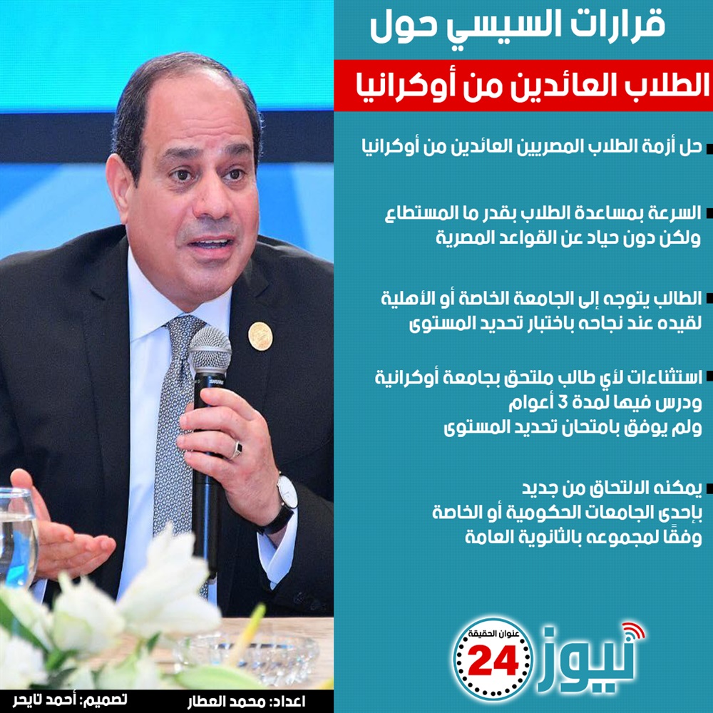 قرارات السيسي حول الطلاب العائدين من أوكرانيا.. "إنفوجراف" الثلاثاء 29/مارس/2022 - 05:36 م 3/29/2022 5:36:55 PM إعداد: محمد العطار - تصميم: أحمد تايجر وجه الرئيس عبدالفتاح السيسي بعدد من القرارات الهامة بشأن الطلاب العائدين من أوكرانيا.