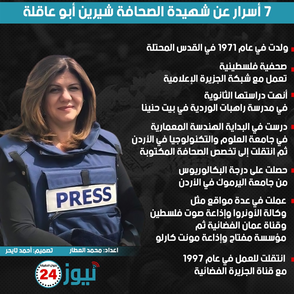 7 أسرار عن شهيدة الصحافة شيرين أبو عاقلة.. "إنفوجراف" الأربعاء 11/مايو/2022 - 08:51 م 5/11/2022 8:51:00 PM إعداد: محمد العطار - تصميم: أحمد تايجر استشهدت فجر اليوم الأربعاء شيرين أبو عاقلة مراسلة قناة الجزيرة الإخبارية، برصاص الجيش الإسرائيلي في الضفة الغربية المحتلة.
