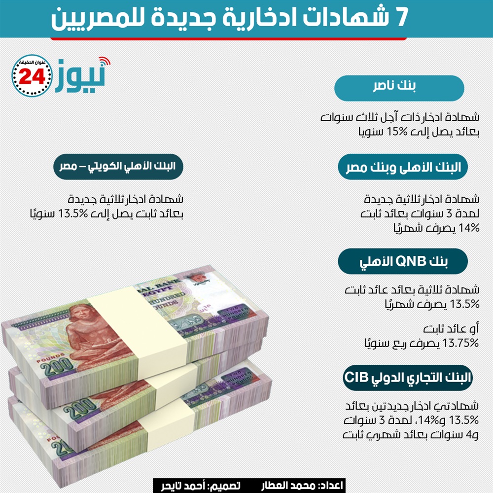 7 شهادات ادخارية جديدة للمصريين.. "إنفوجراف" الثلاثاء 31/مايو/2022 - 06:10 م 5/31/2022 6:10:49 PM إعداد: محمد العطار - تصميم: أحمد تايجر طرحت عدد من البنوك المصرية على إصدار شهادات ادخارية بفوائد ومدد محددة.