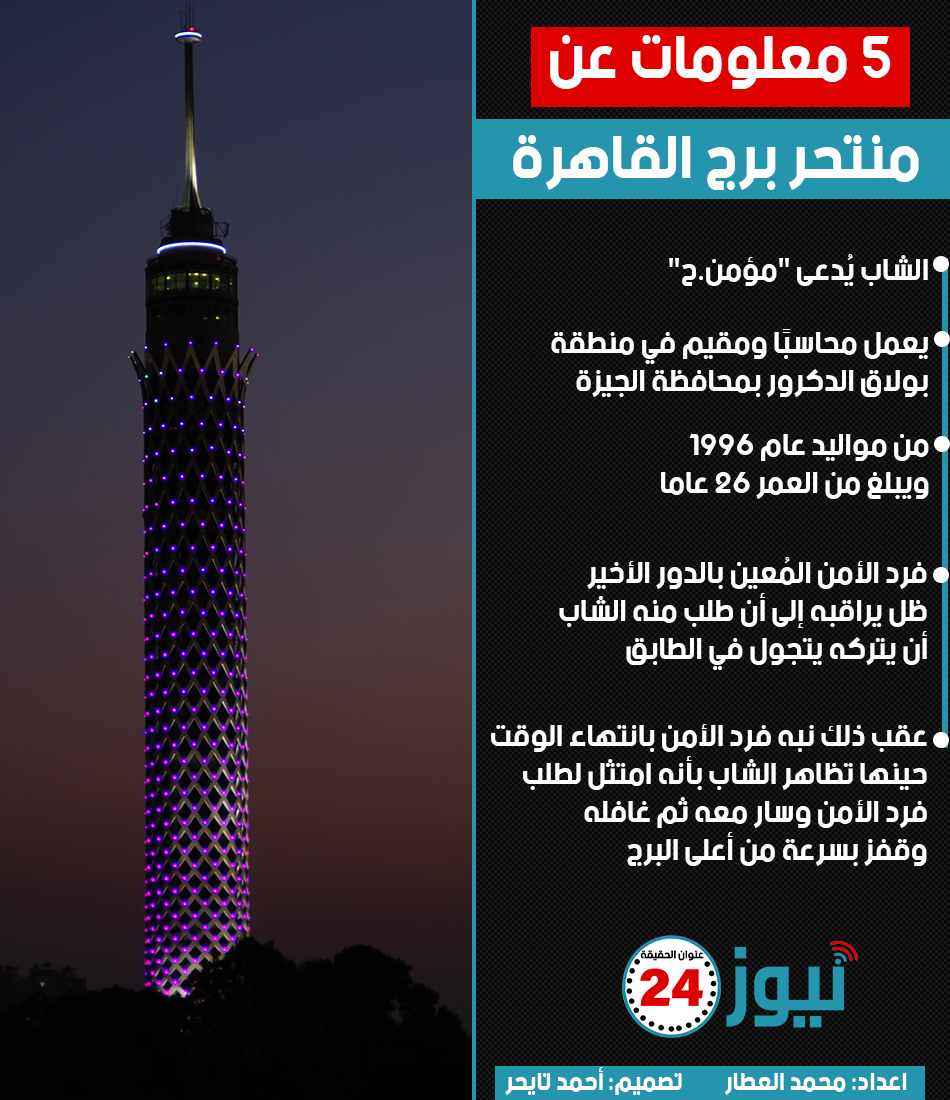 5 معلومات عن منتحر برج القاهرة.. "إنفوجراف" الثلاثاء 21/يونيو/2022 - 04:43 م 6/21/2022 4:43:55 PM إعداد: محمد العطار - تصميم: أحمد تايجر أقدم شاب على إلقاء نفسه من أعلى برج القاهرة، فقد فوجىء المارة بشاب يسقط جثة هامدة أمامهم بعد أن قام بإلقاء نفسه من أعلى برج القاهرة في منطقة قصر النيل بالعاصمة، والذي يبلغ ارتفاعه 187مترًا.