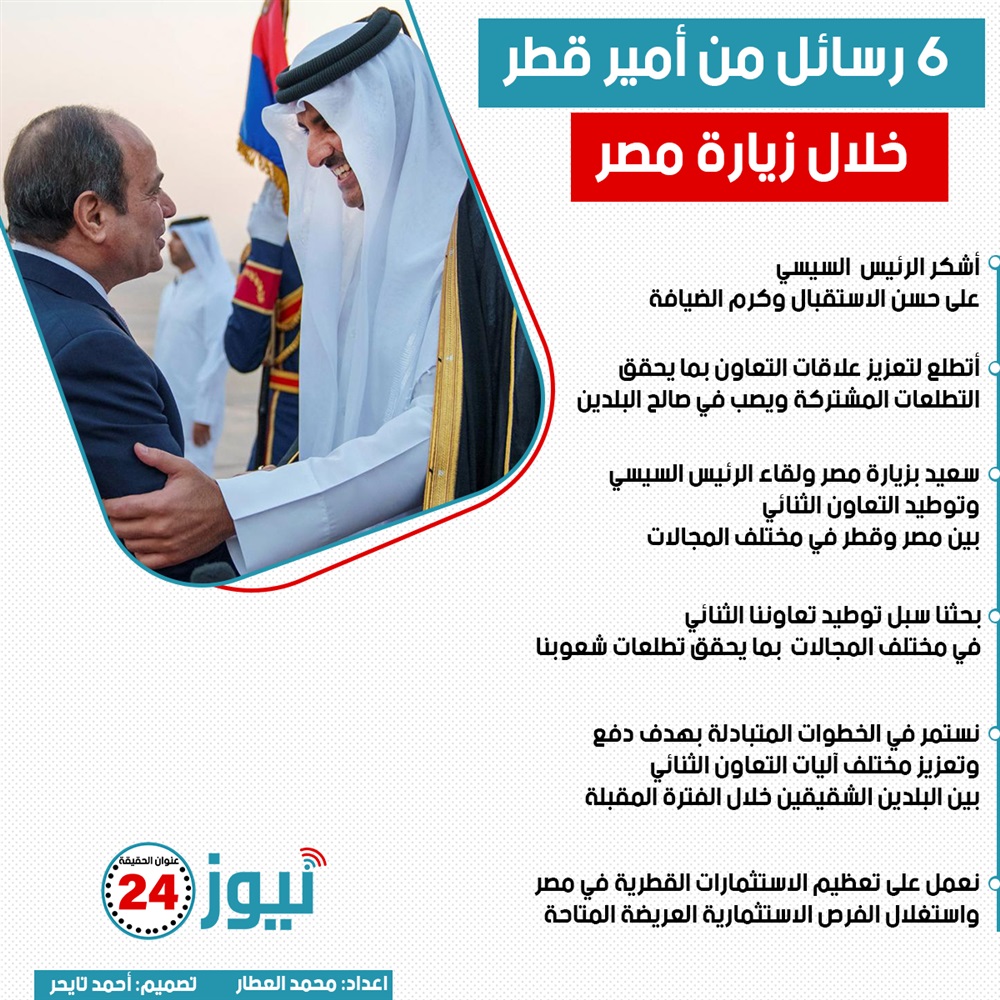 6 رسائل من أمير قطر خلال زيارة مصر.. "إنفوجراف" السبت 25/يونيو/2022 - 04:30 م 6/25/2022 4:30:40 PM إعداد: محمد العطار - تصميم: أحمد تايجر ودع الرئيس عبدالفتاح السيسي، سمو الأمير تميم بن حمد آل ثاني، أمير دولة قطر، بمطار القاهرة الدولي، وذلك في ختام زيارته لمصر اليوم السبت بقصر الاتحادية.