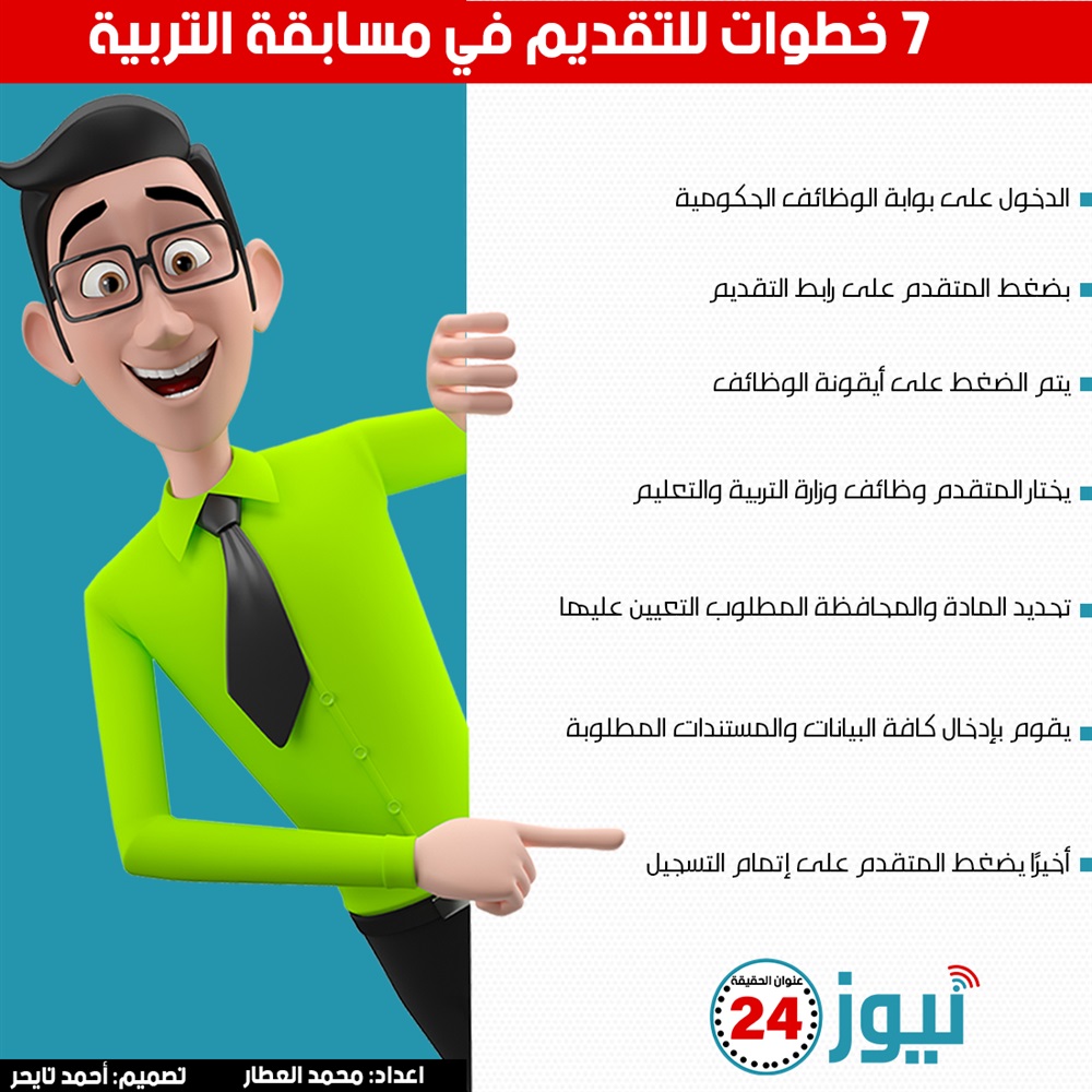 7 خطوات للتقديم في مسابقة التربية.. "إنفوجراف" الثلاثاء 28/يونيو/2022 - 09:40 م 6/28/2022 9:40:56 PM إعداد: محمد العطار - تصميم: أحمد تايجر أعلنت وزارة التربية والتعليم تفاصيل مسابقة الـ30 ألف معلم التي كان ينتظرها المصريين خلال الفترة الأخيرة.